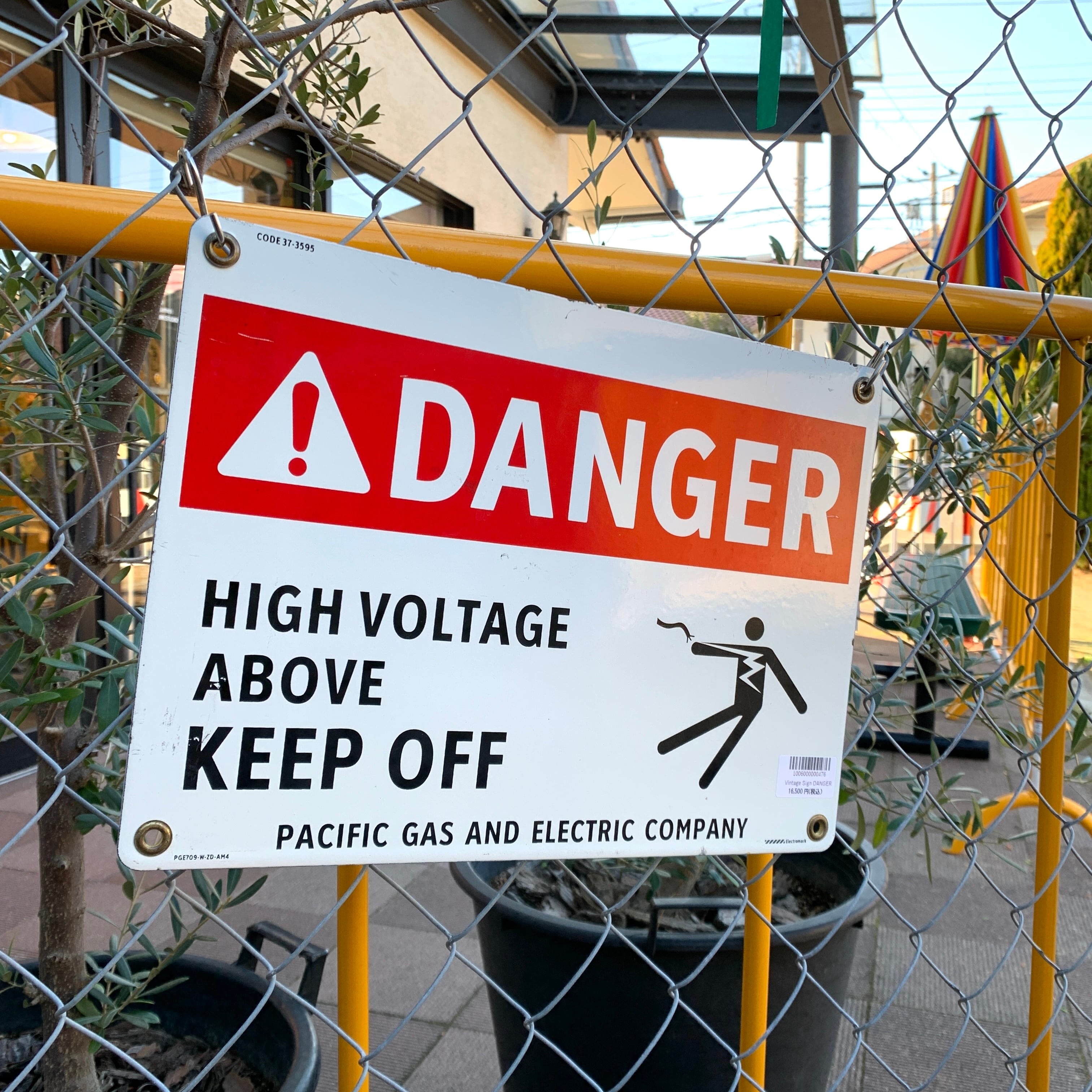 「危険、高電圧区域につき立ち入り禁止」を意味し、電柱や鉄塔付近のフェンスなどで使用されていたものかと思われます。
