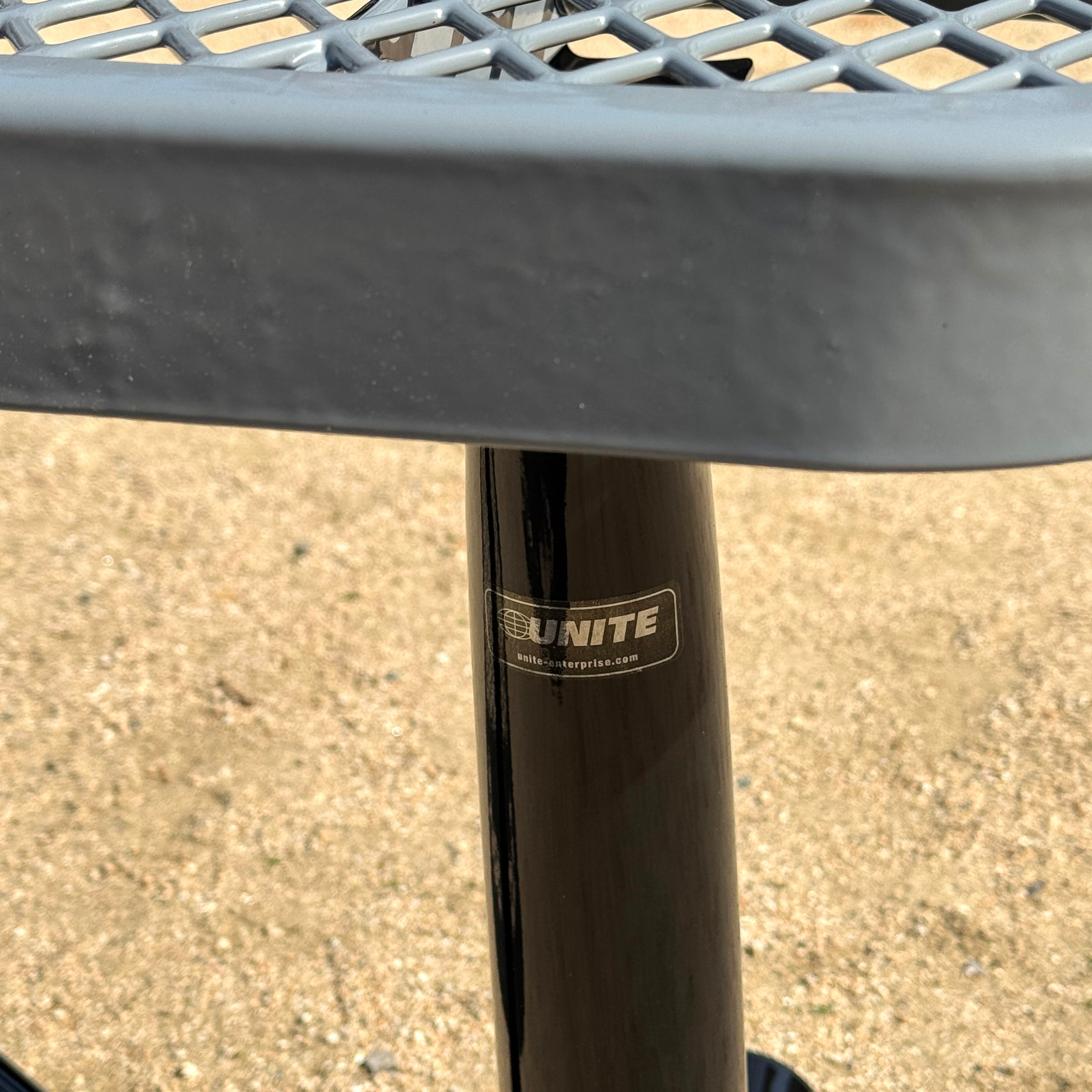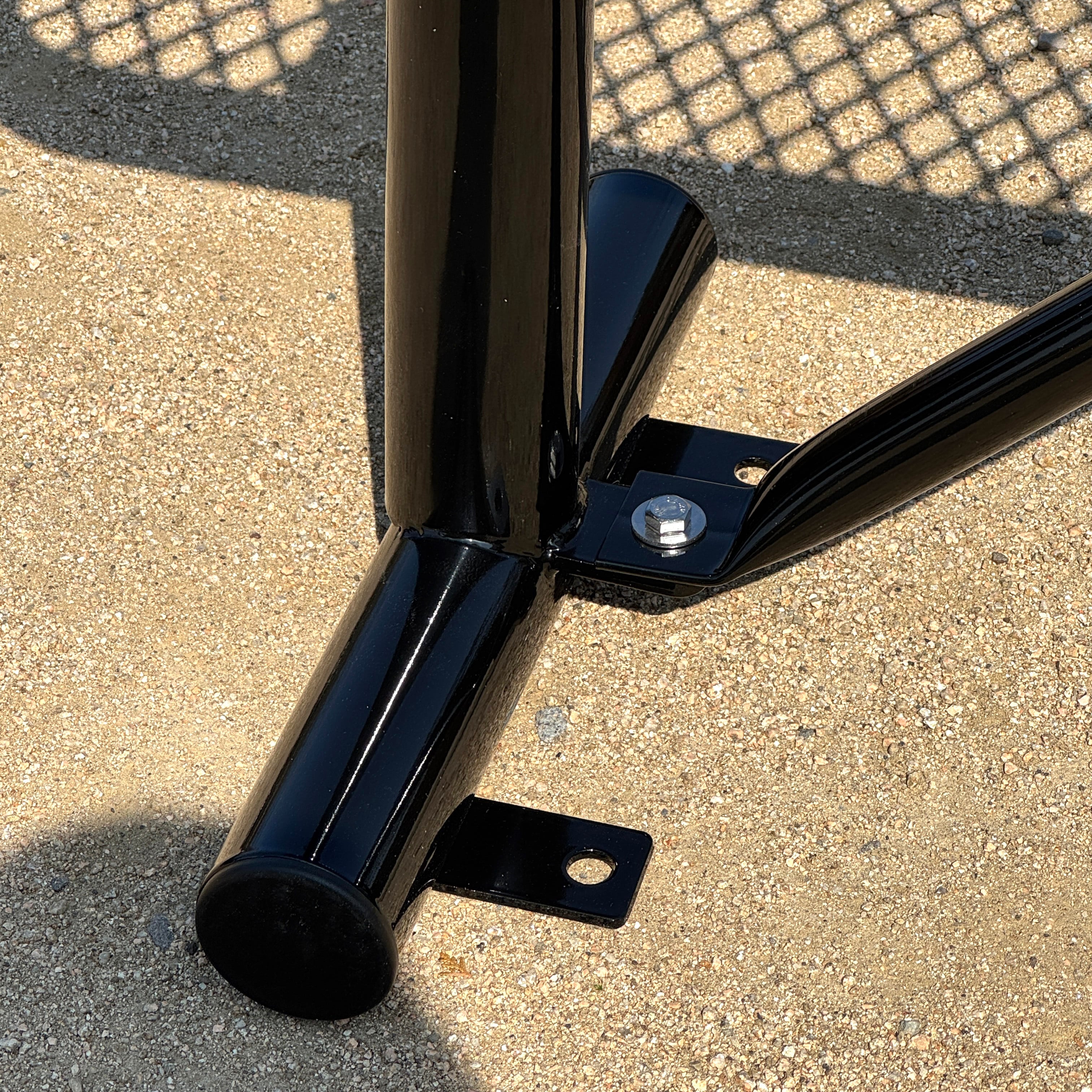 重量のある脚部は安定感のある座り心地で、地面へのアンカー固定用のビス穴付き。店舗や屋外スペースにも安心して設置できます。