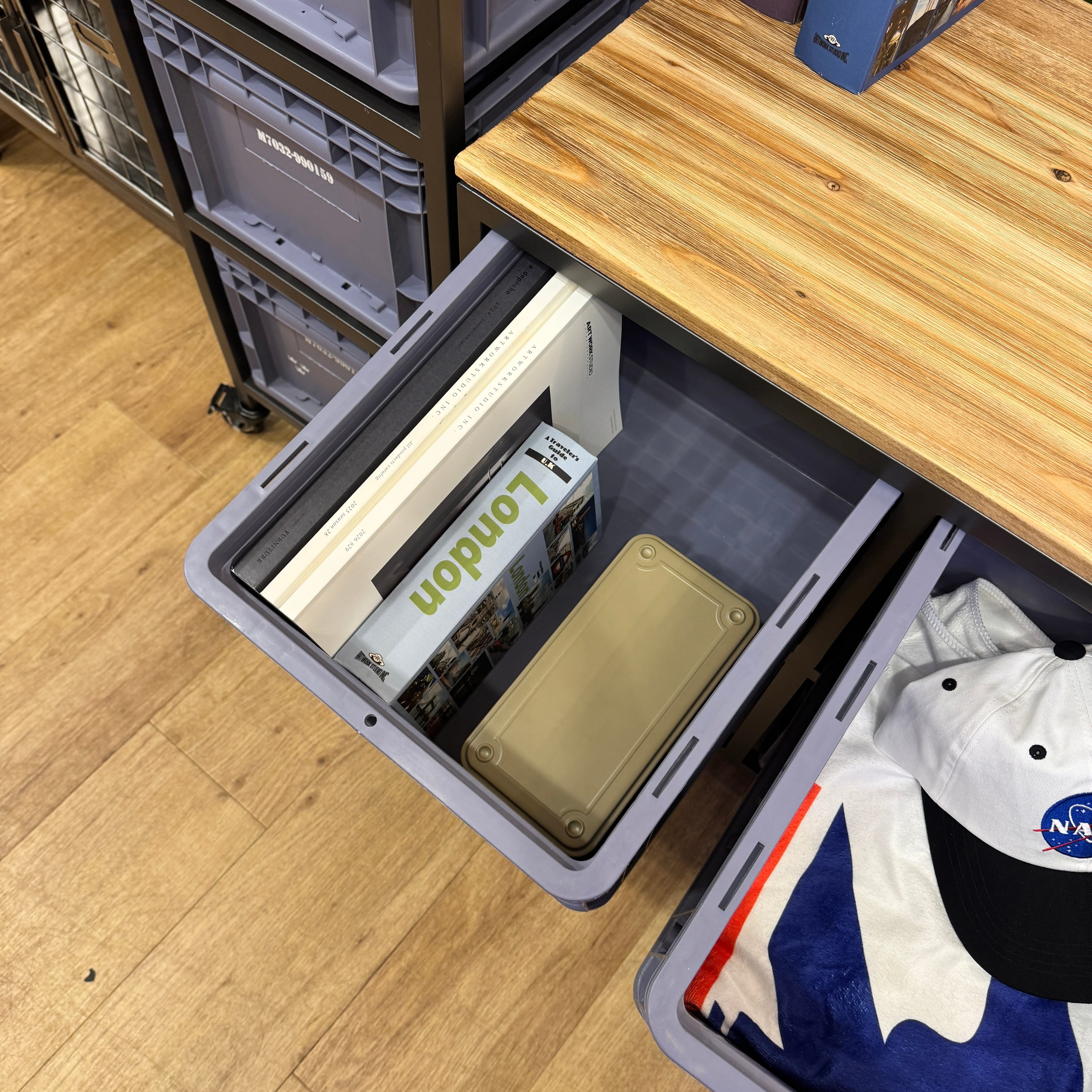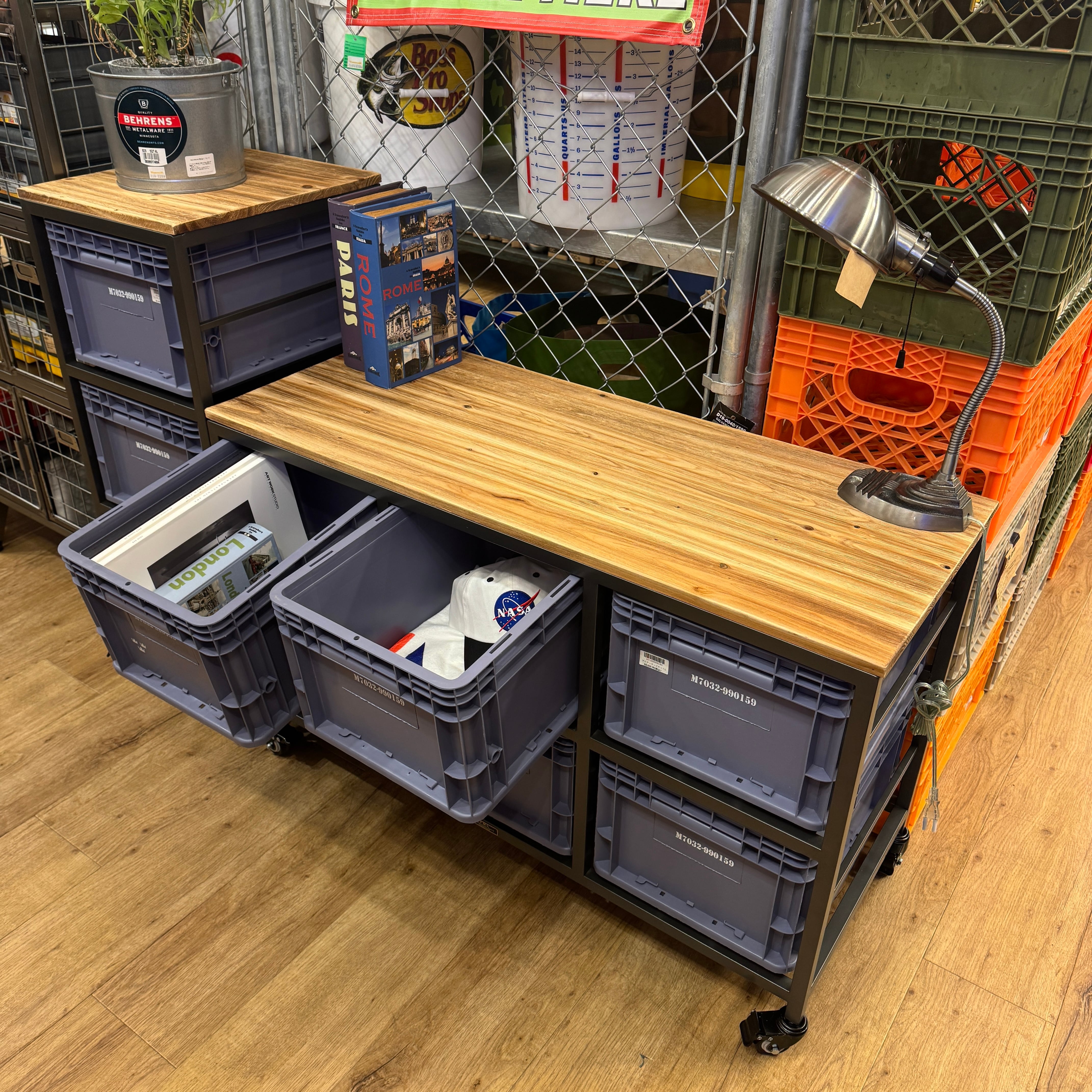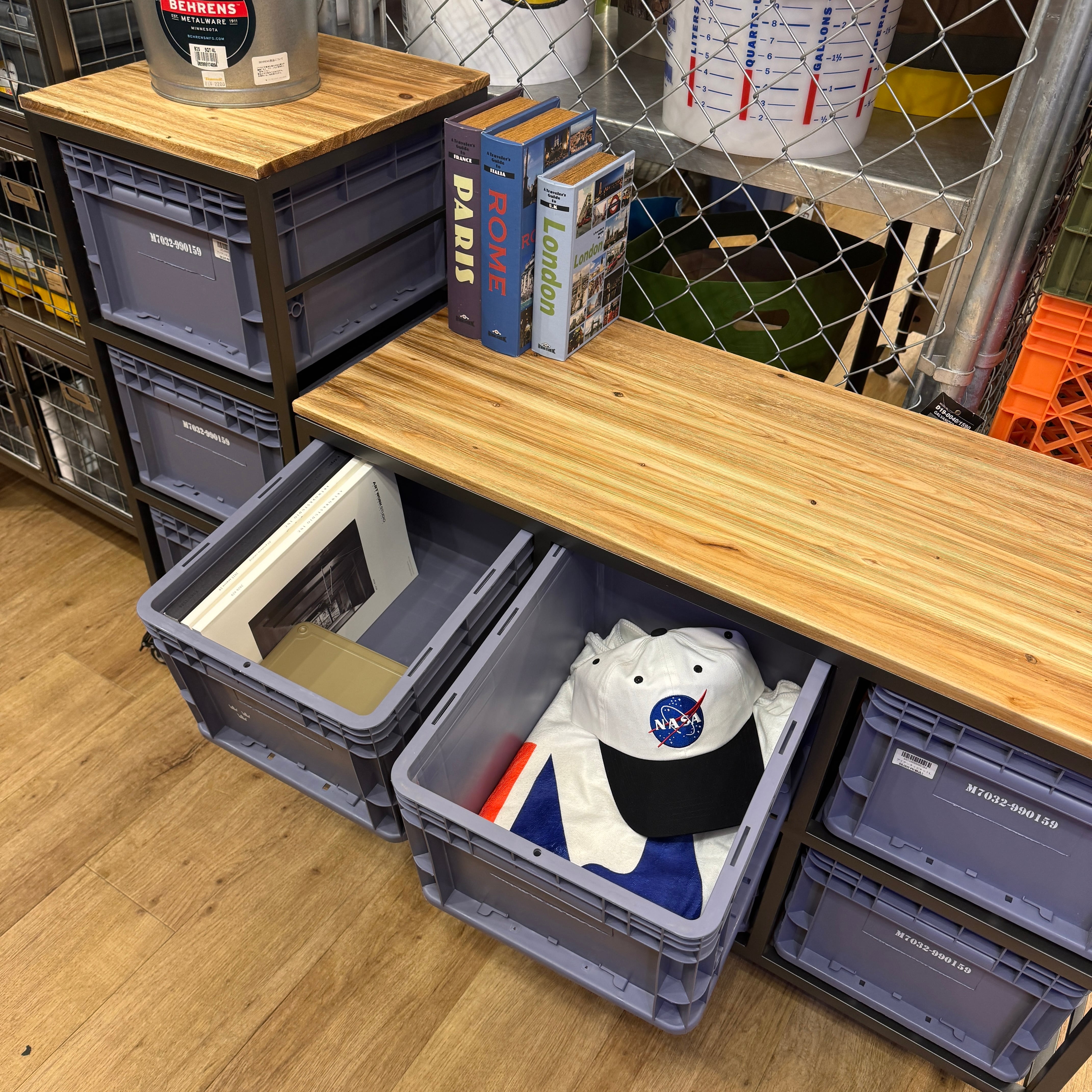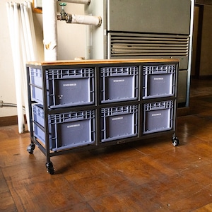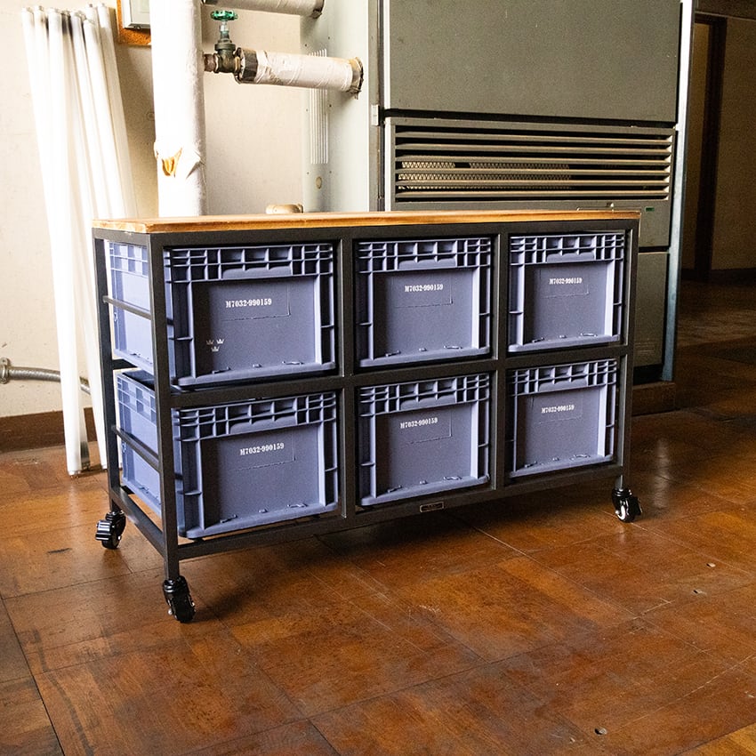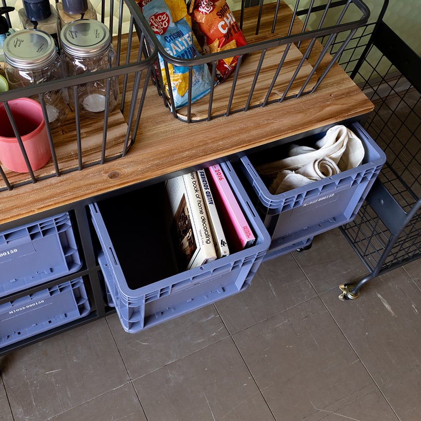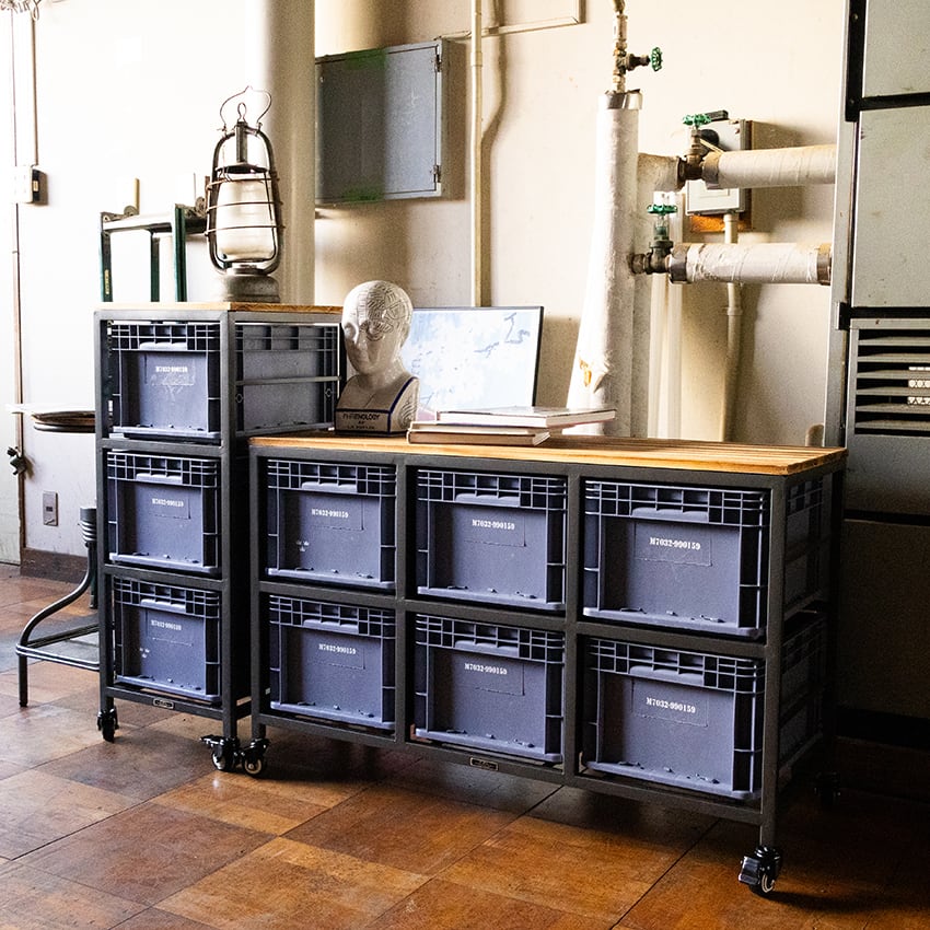 スチールフレームに樹脂コンテナを組み合わせた、インダストリアル収納。
