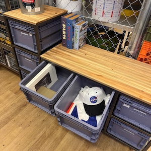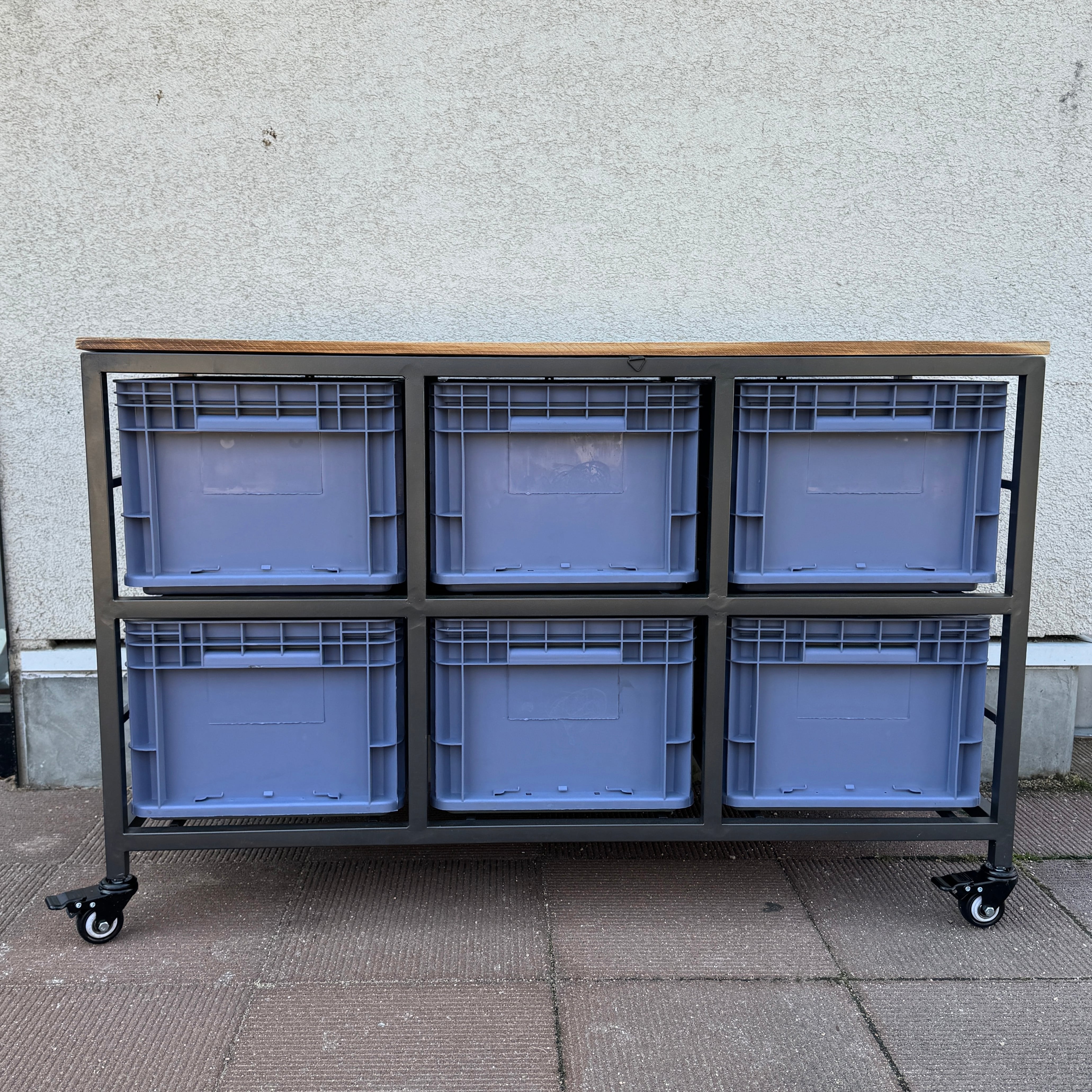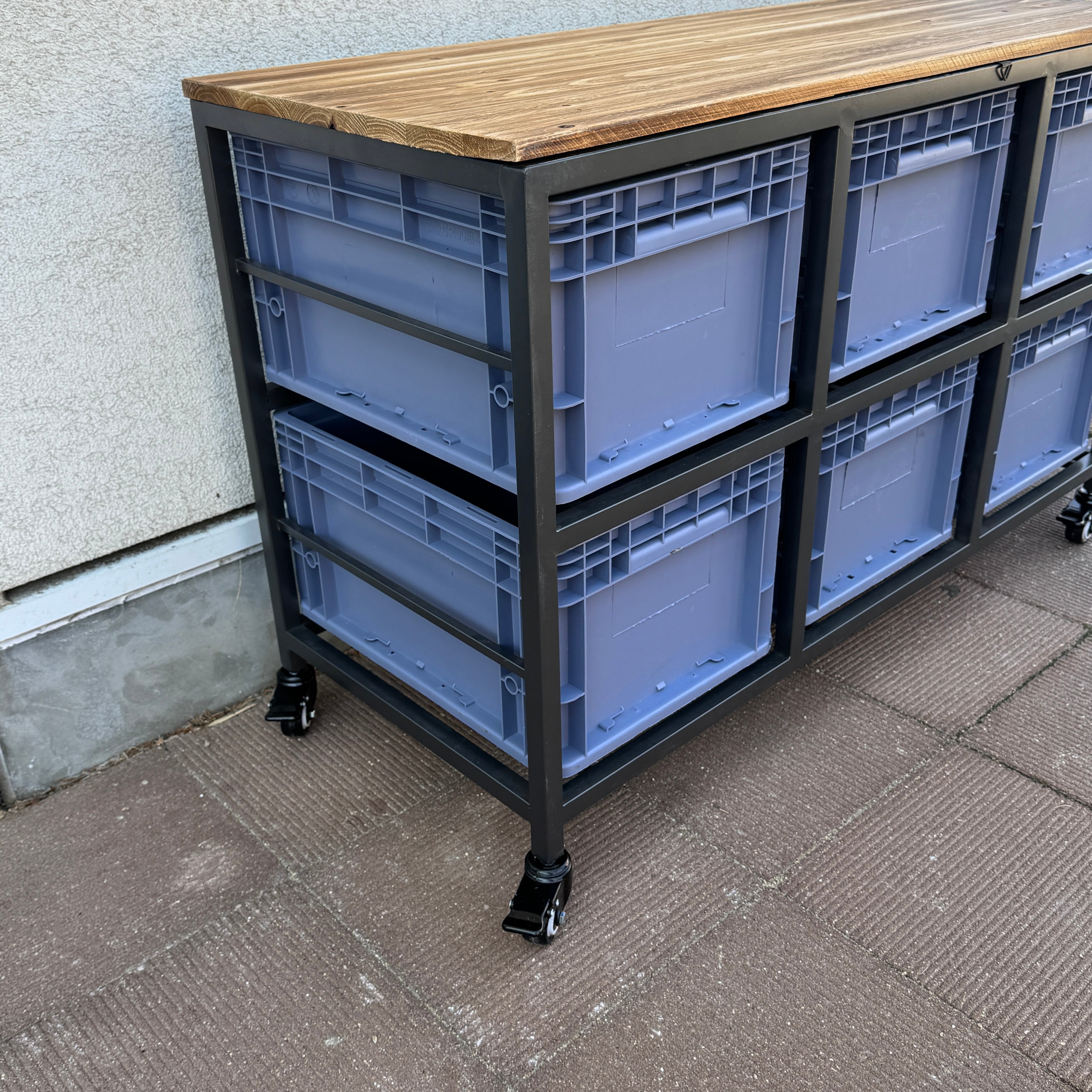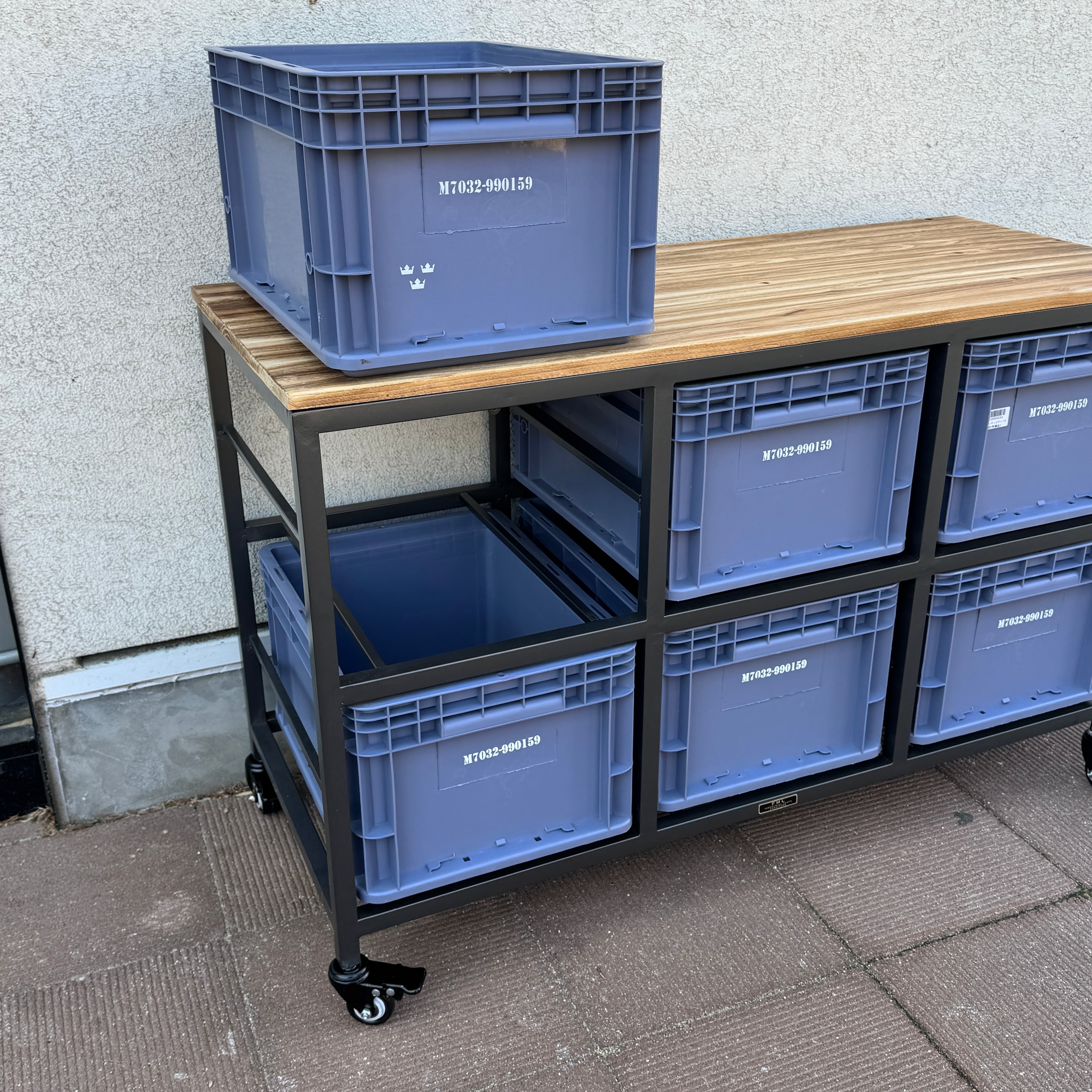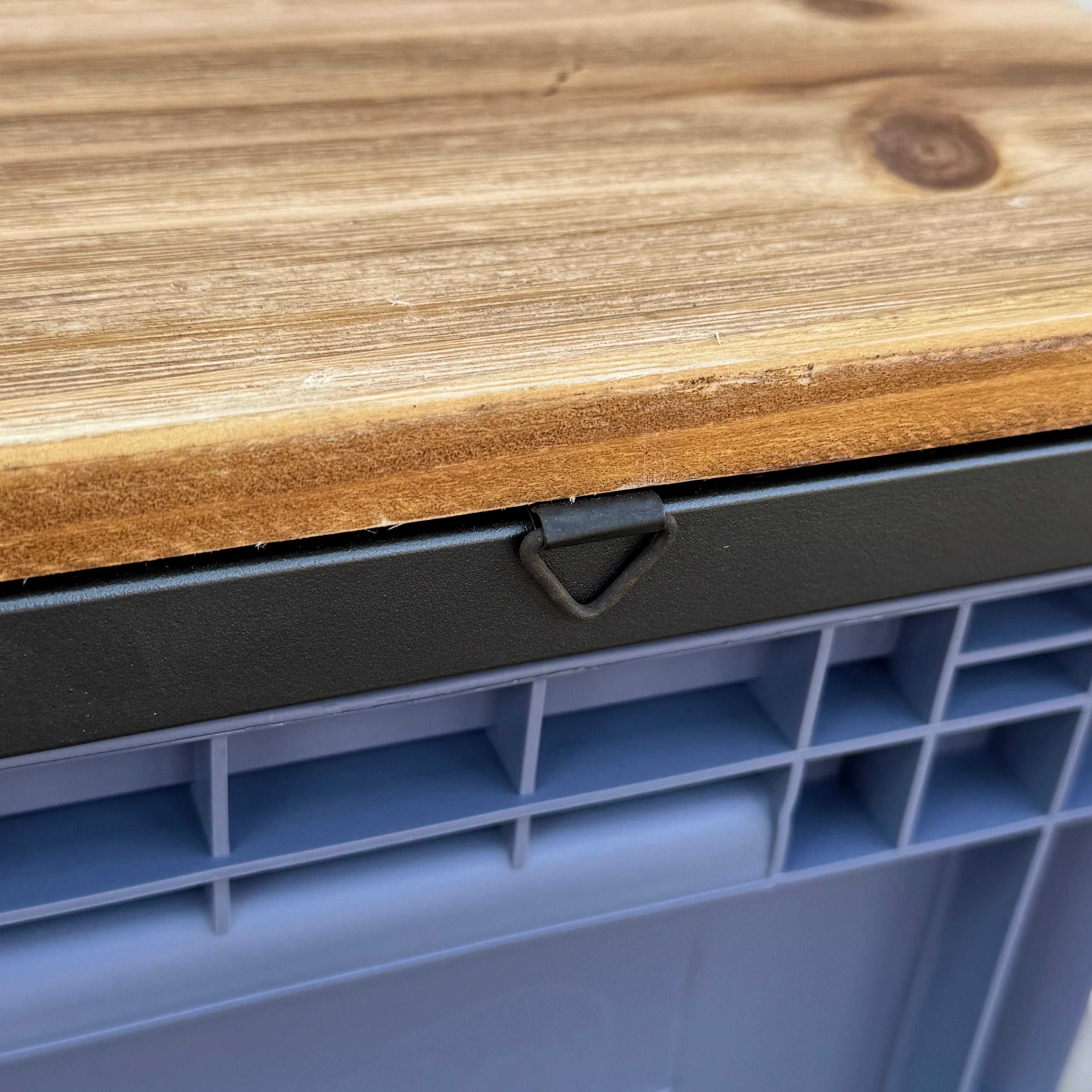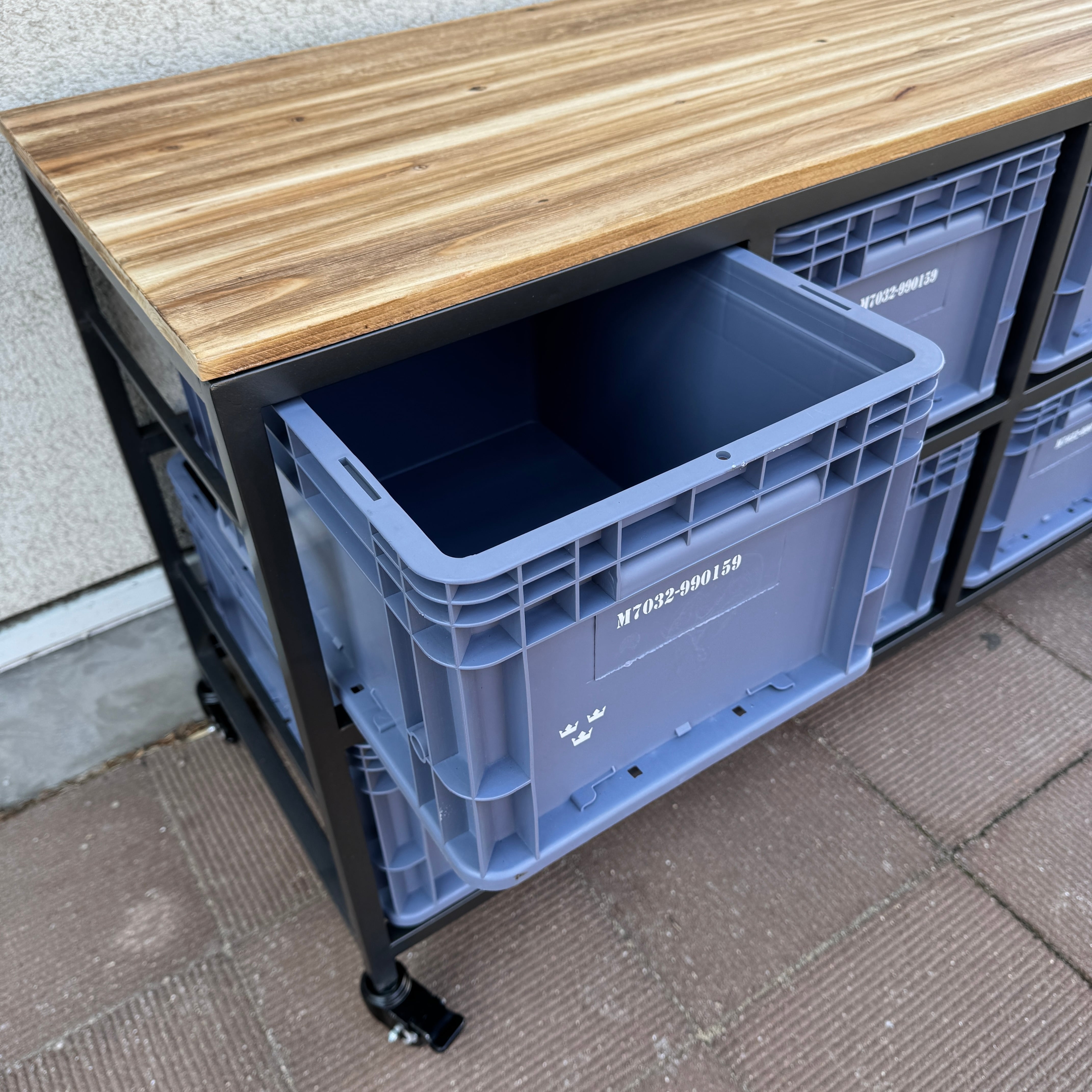 スチールフレームに樹脂コンテナを組み合わせた、インダストリアル収納。
