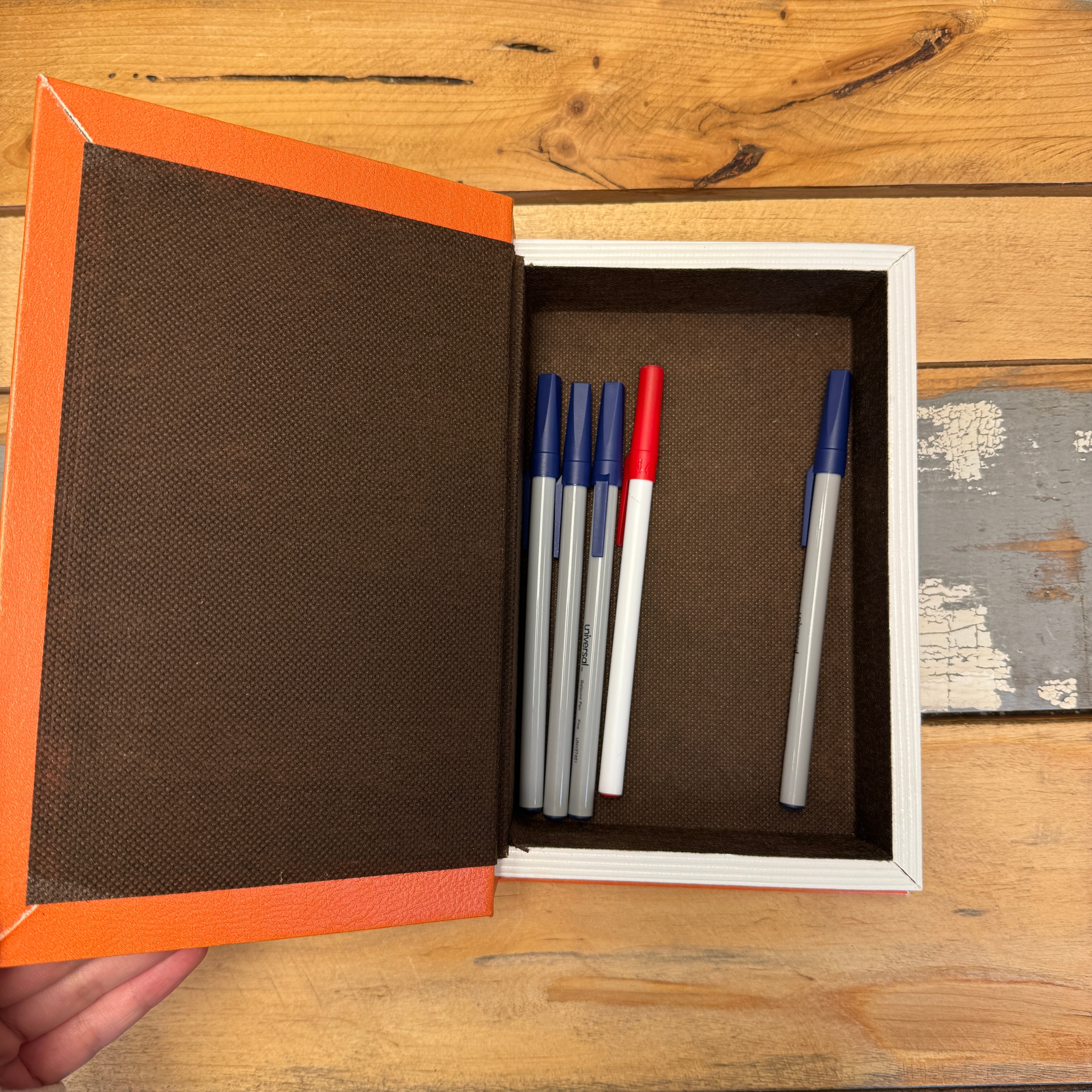中を開くと収納スペースになっており、文房具や救急セットなどの小物をまとめるのに便利。