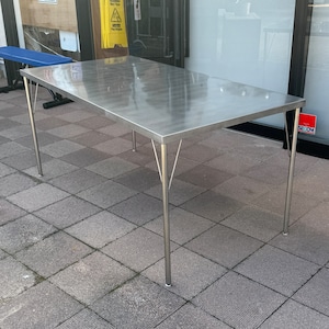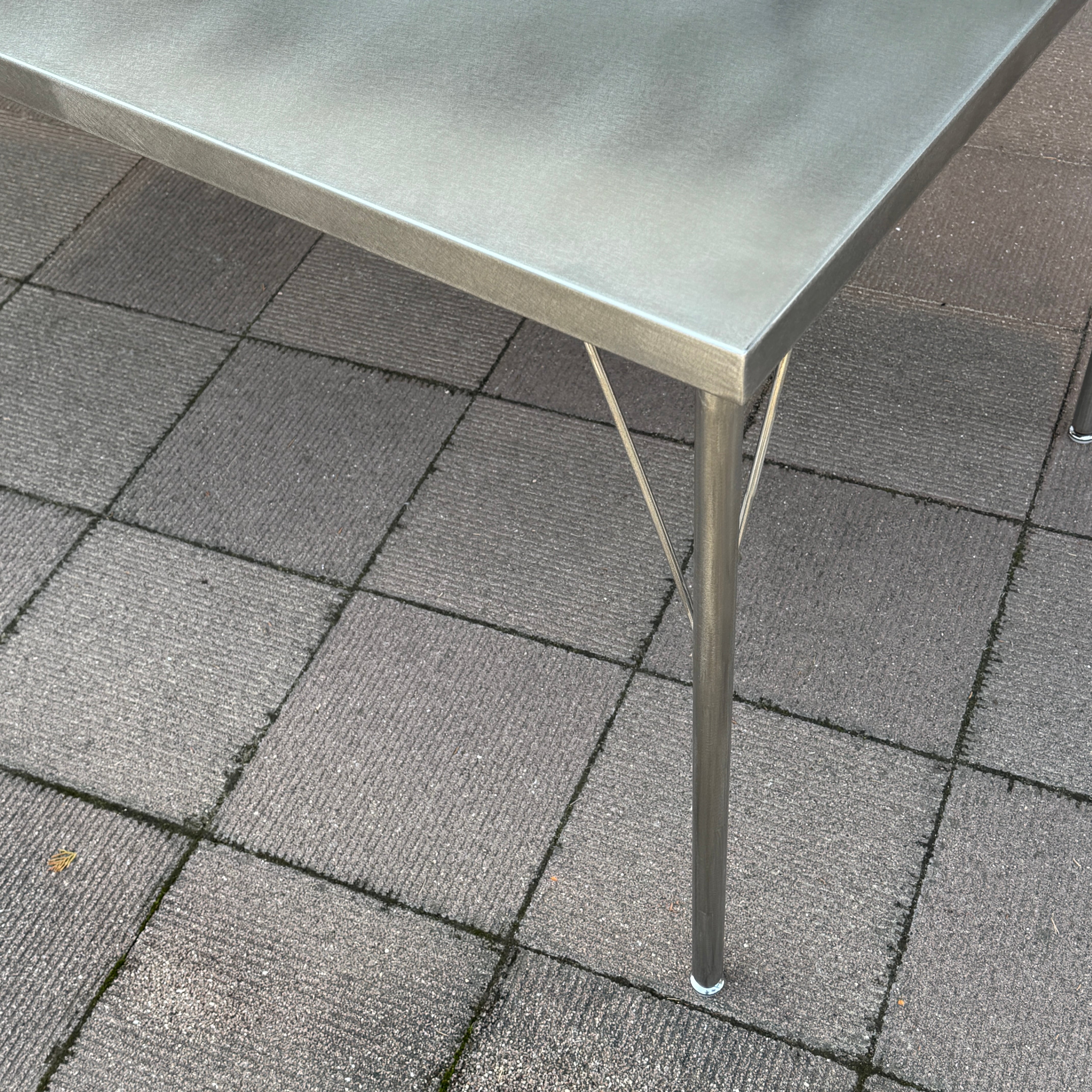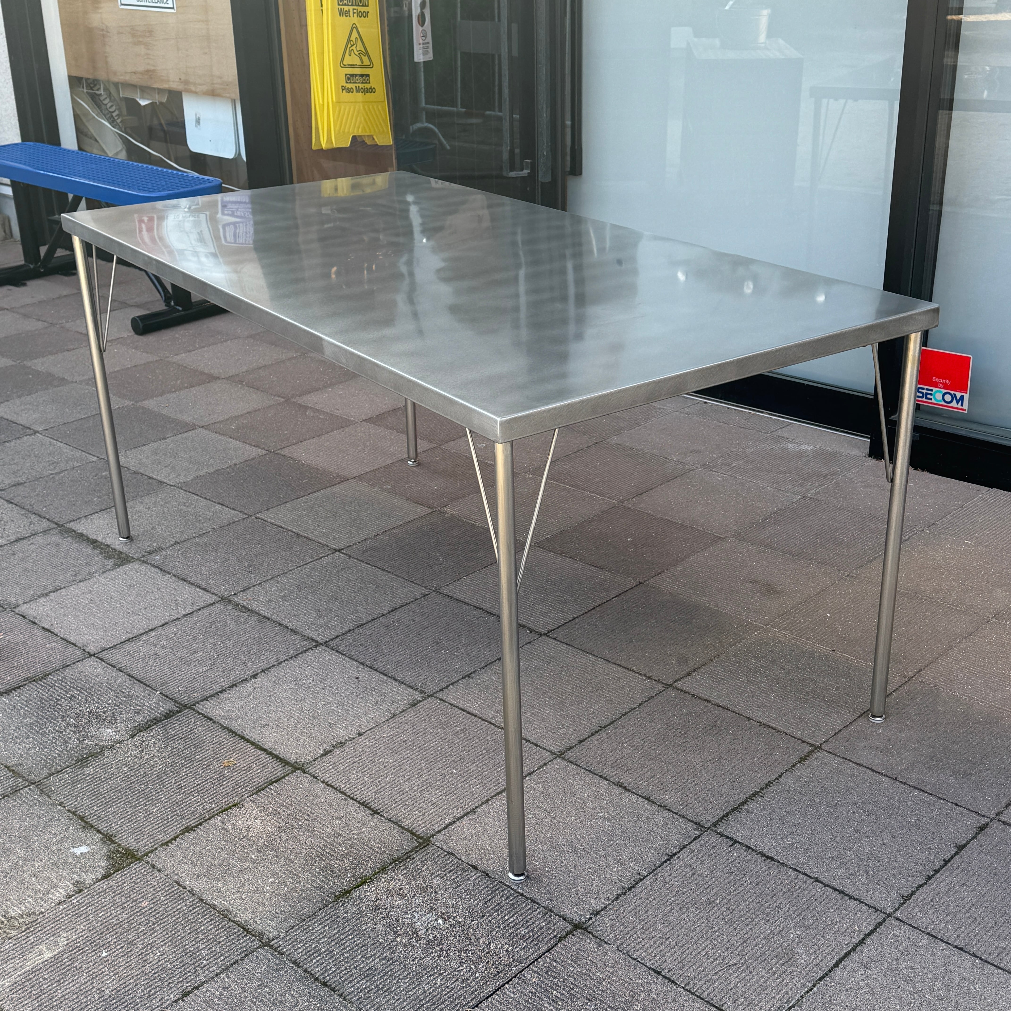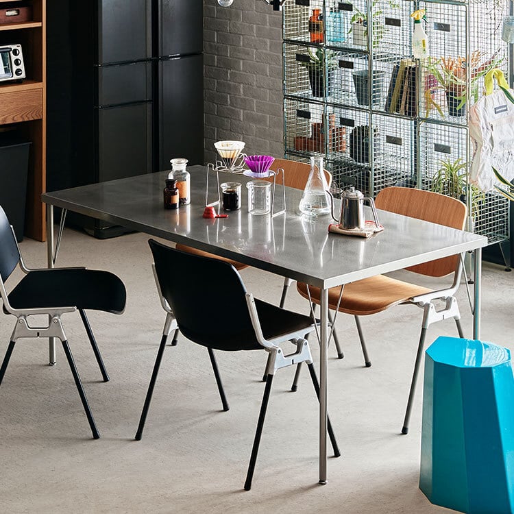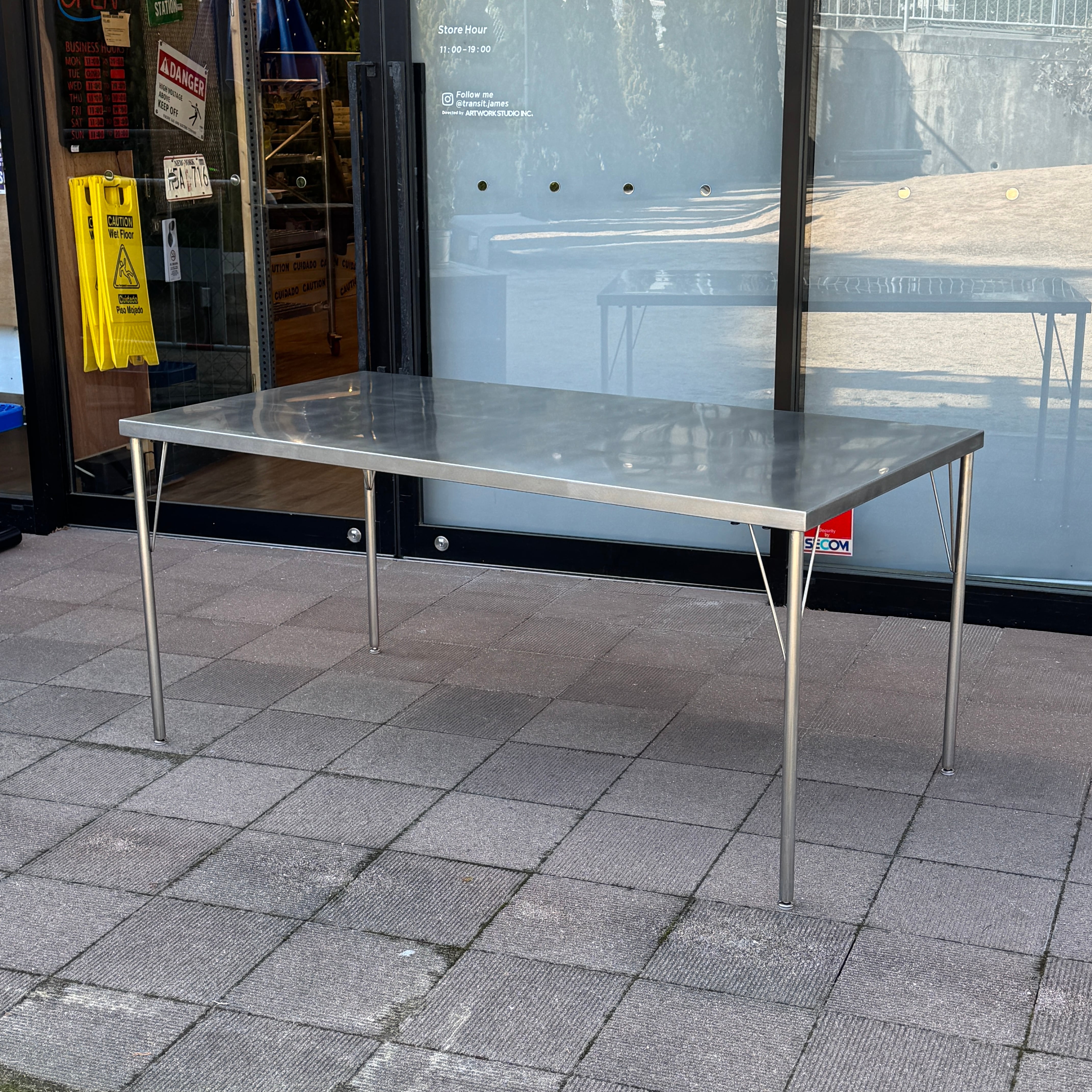 無機質で洗練された空気感を纏う、ステンレスのダイニングテーブル。