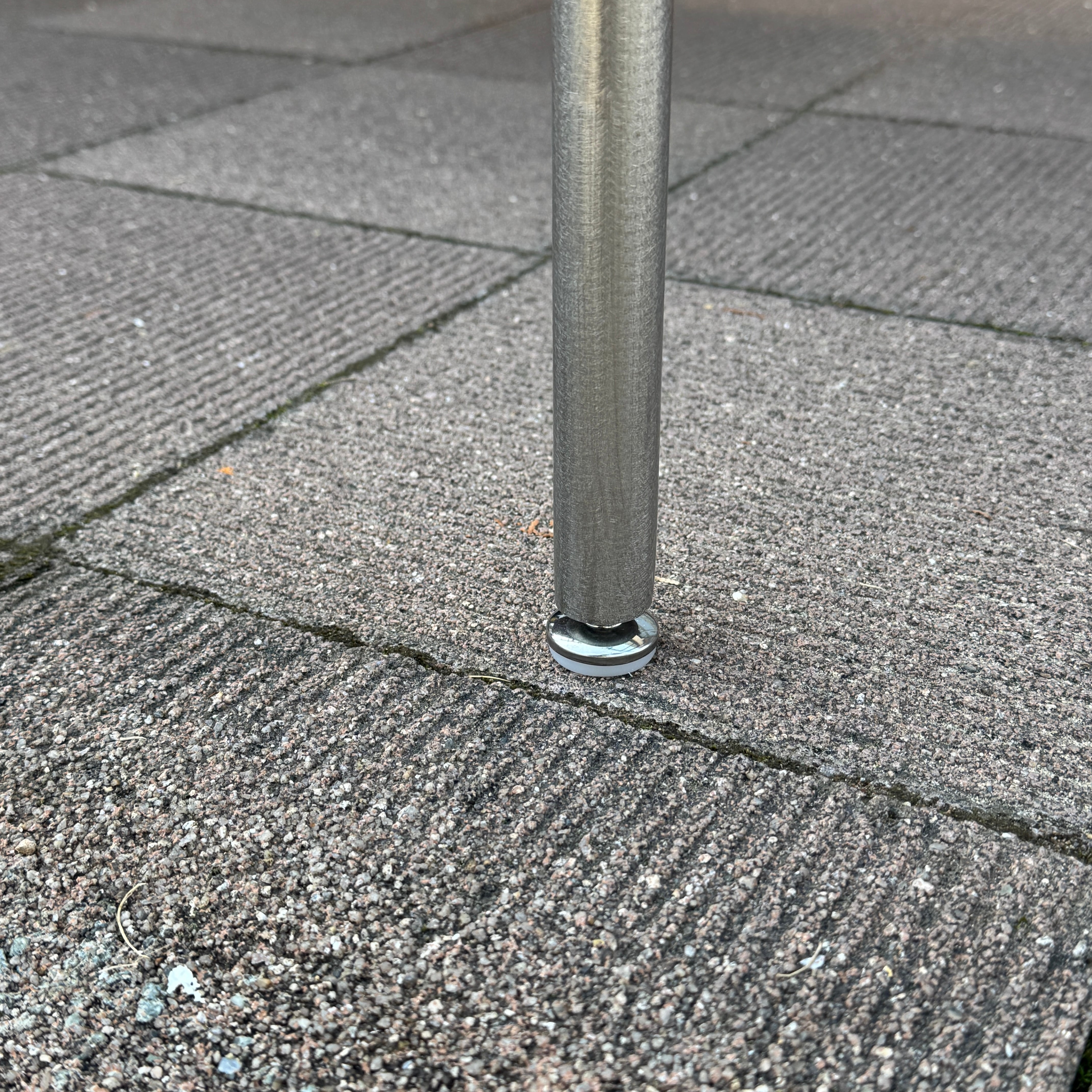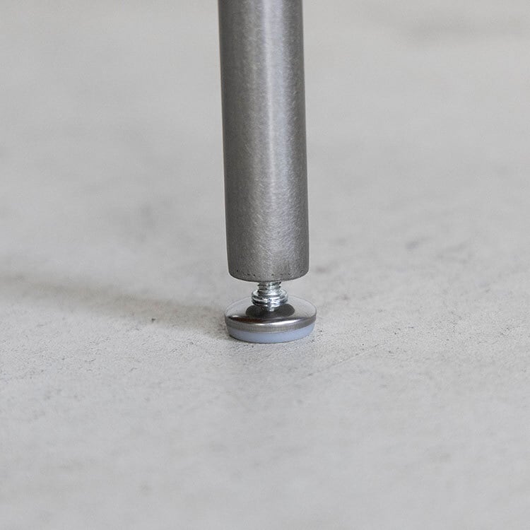 天板の存在感を邪魔しないシンプルな丸脚を採用。脚先にはガタつきを防止するアジャスターを備えており、床の状況に合わせて細かな調整が可能です。