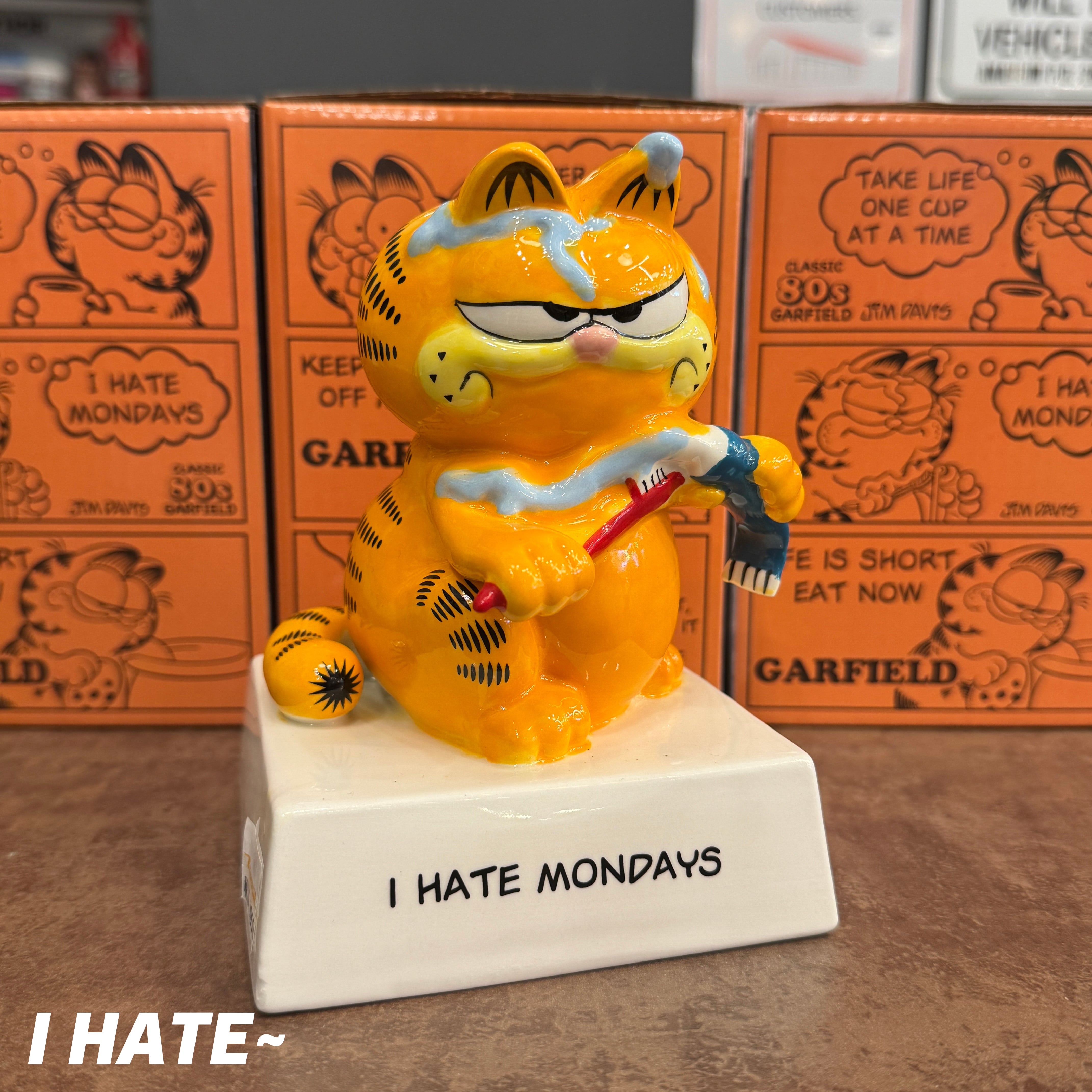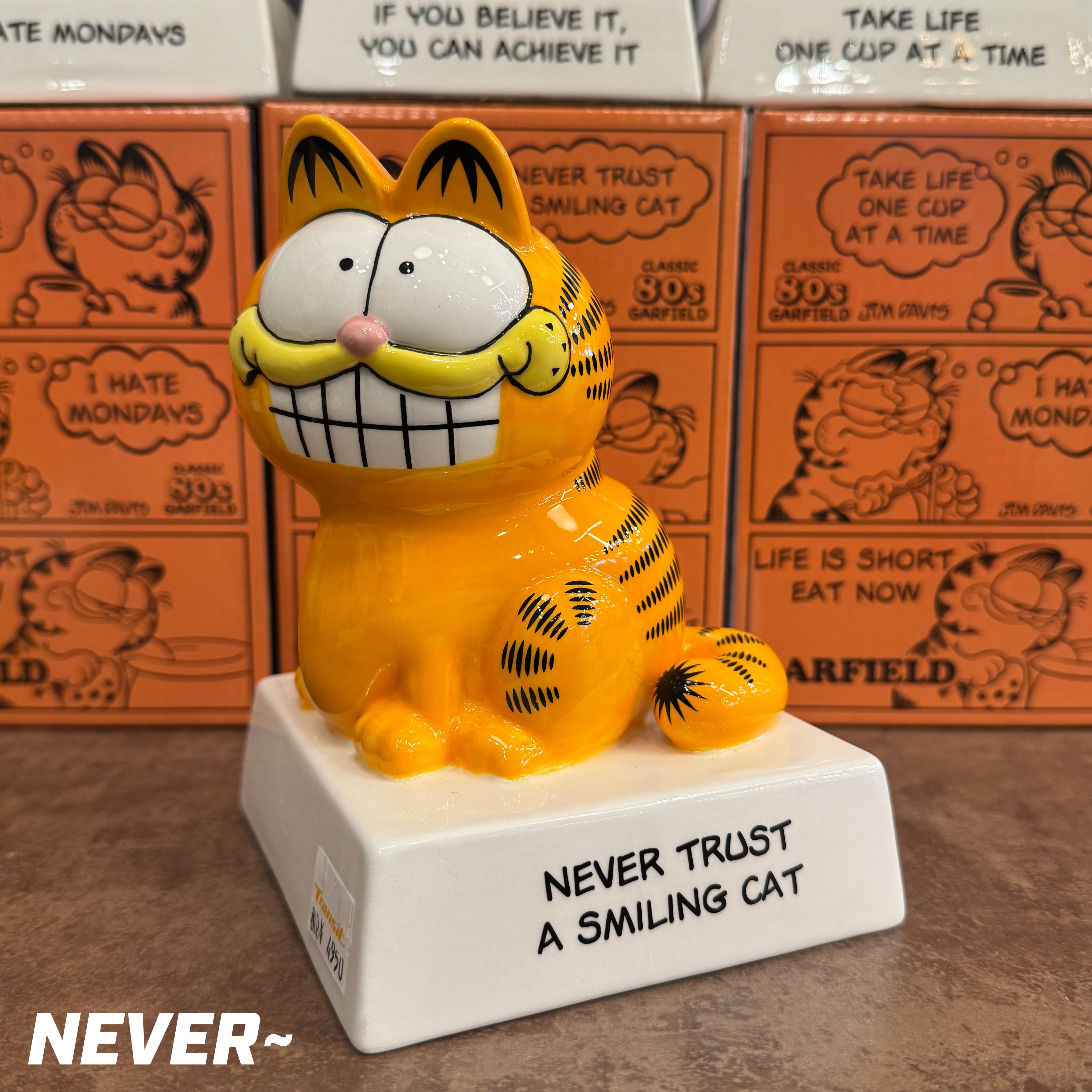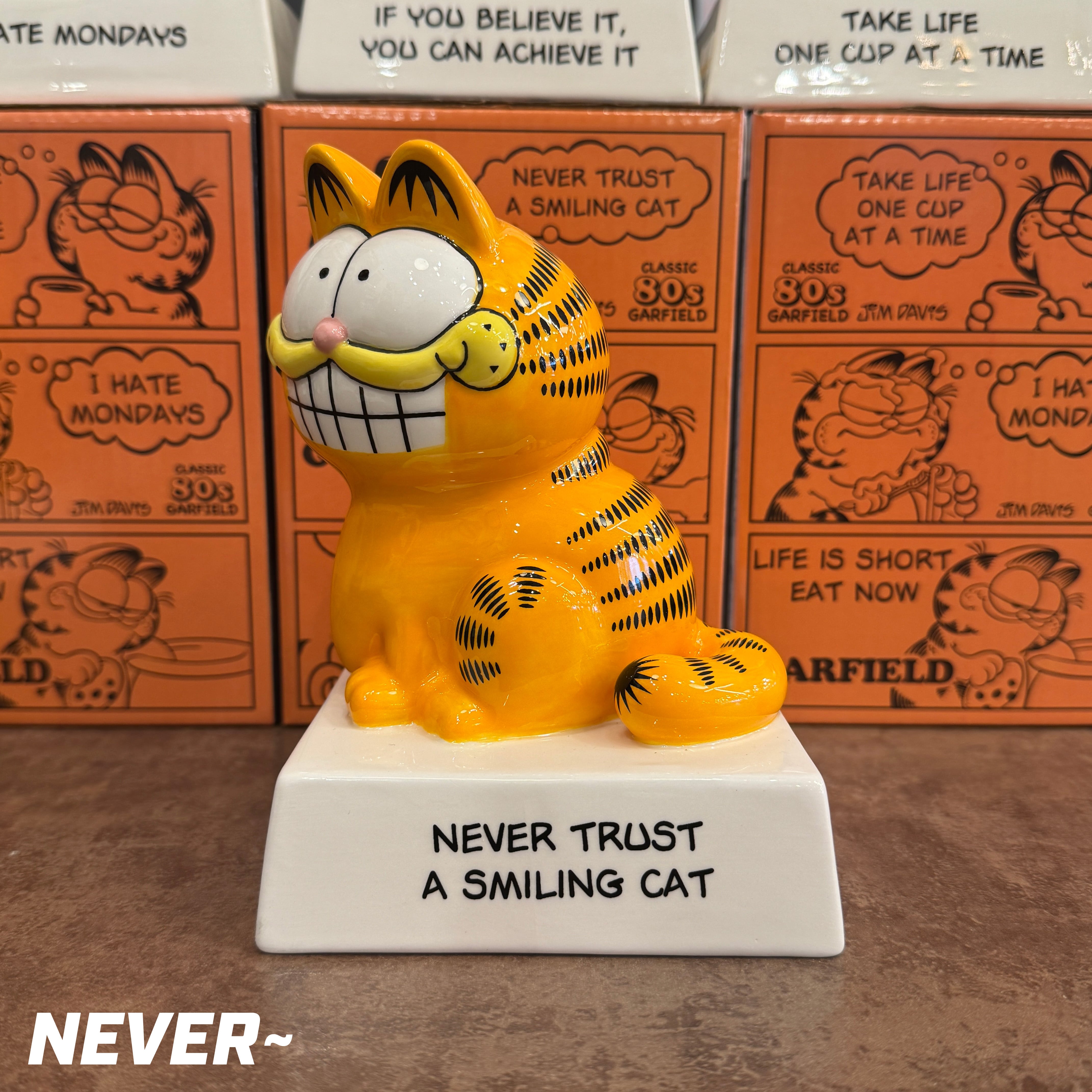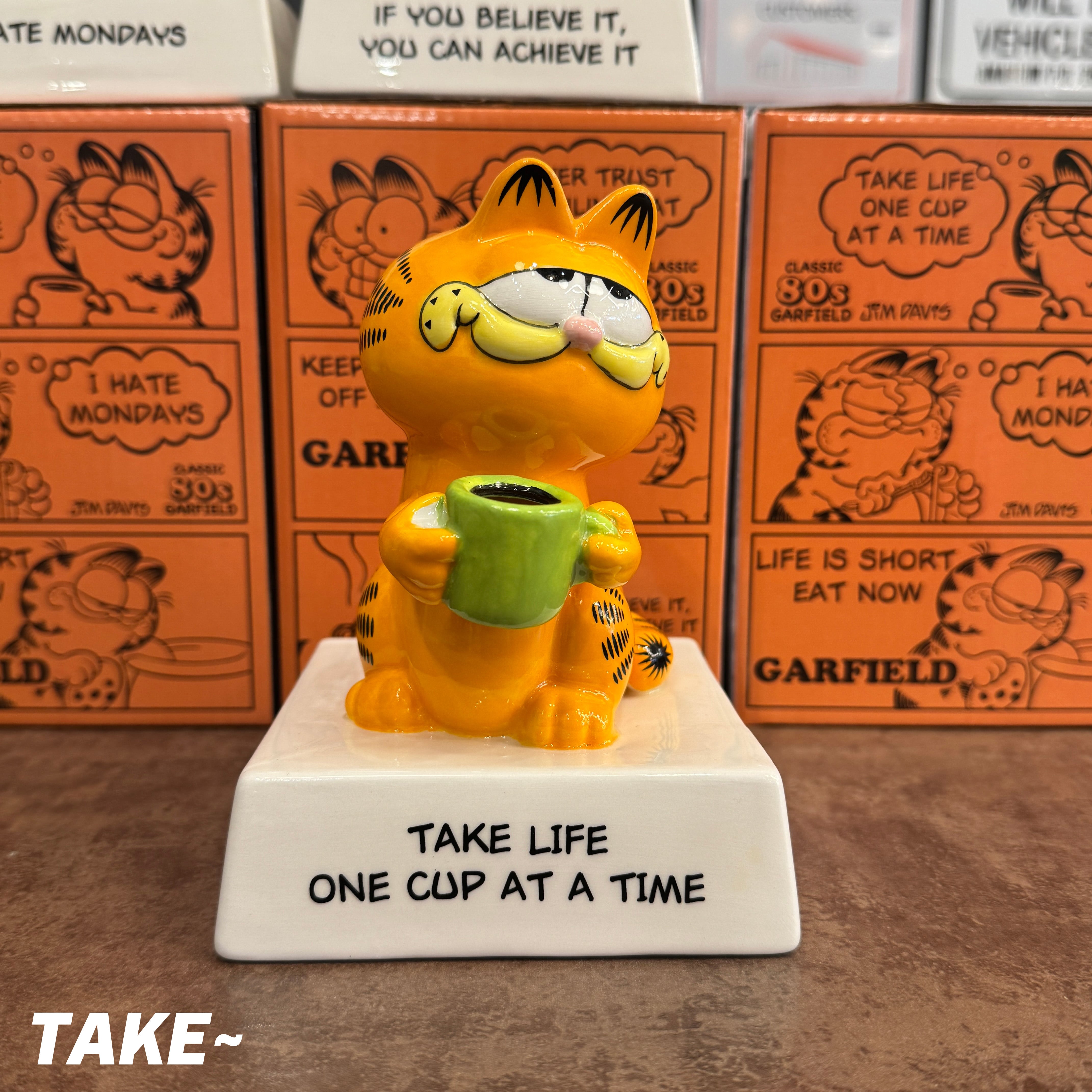 ヴィンテージ感を忠実に再現したデザインで、各台座には、ガーフィールドらしい「心に刺さる?名言」が刻まれています!