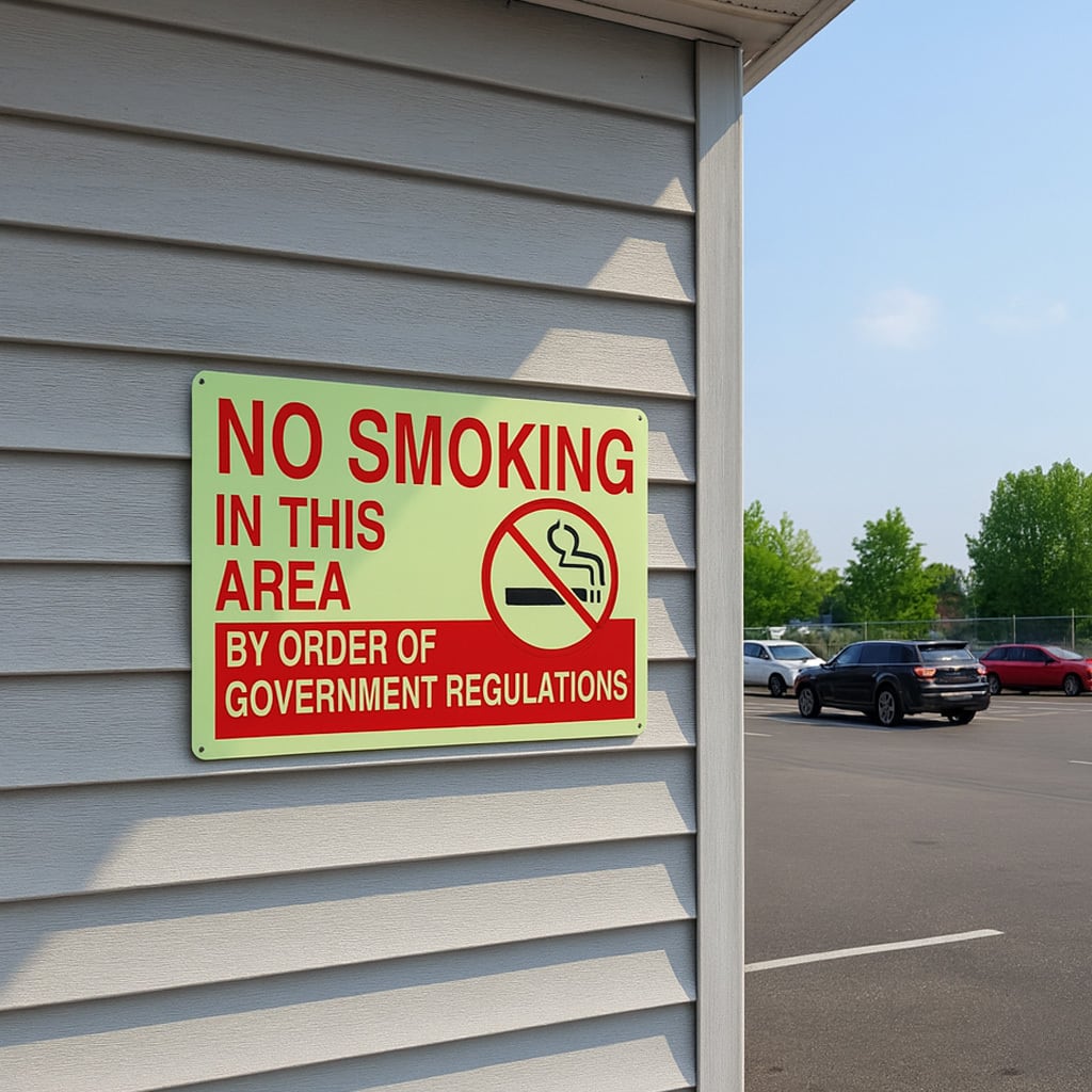 「政府規制の命令によりこのエリアでは禁煙です」と禁煙エリアを知らせるデザイン。